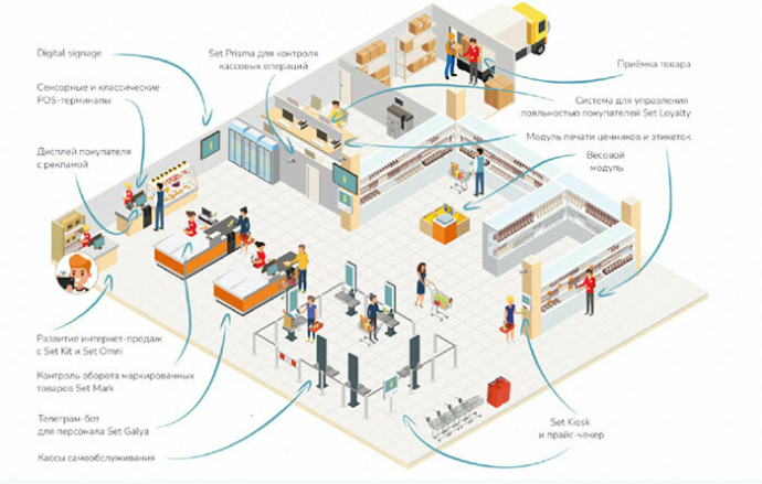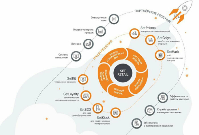 Set Retail предлагает комплексную систему, где ритейлер может выбрать и скомбинировать готовые модули для построения необходимой рабочей среды: