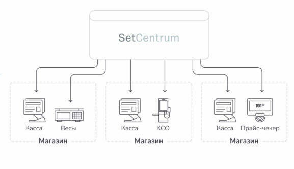 Set Centrum позволяет организовать централизованное управление кассовыми точками и процессами, исключая необходимость установки отдельных серверов в каждом магазине. Это решение идеально для торговых сетей любого масштаба, включая небольшие магазины. В качестве примера: одна из крупных сетей, состоящая из магазинов малого формата, использует один сервер для управления 13300 кассами.